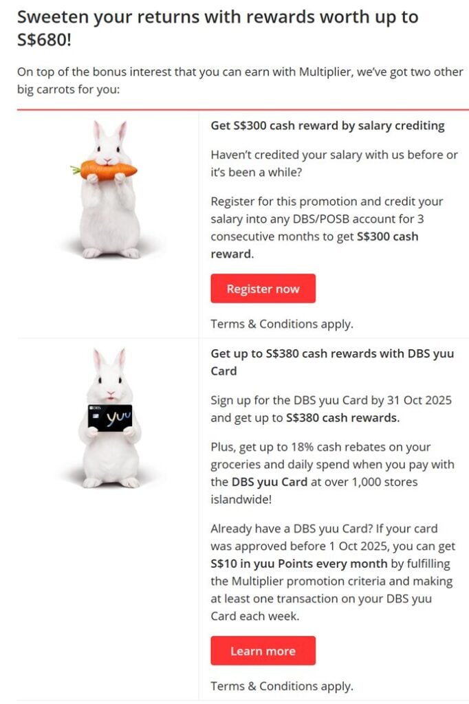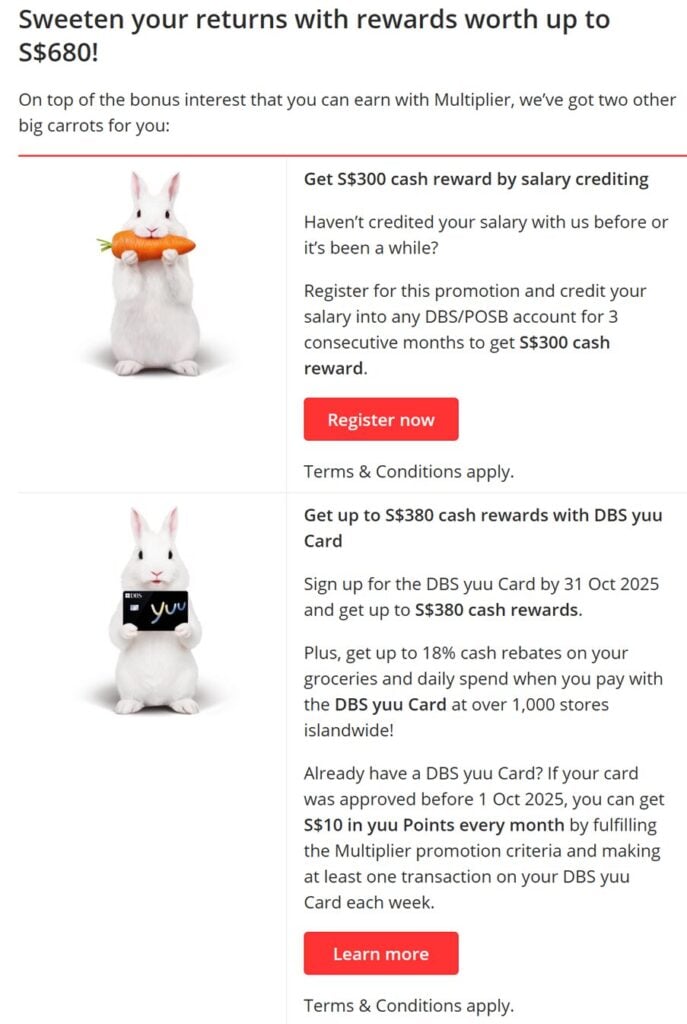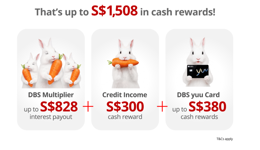 Don’t forget the additional cash rewards as well – which applies if you haven’t credited your salary before or it’s been awhile – plus the cash rewards if you sign up for DBS yuu Card!