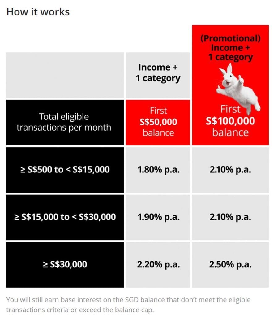 This means that in most months with the above set up, you can get 2.20% or 3.00% on S$100,000 with DBS Multiplier.