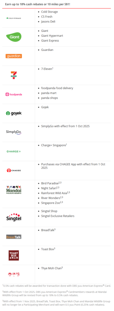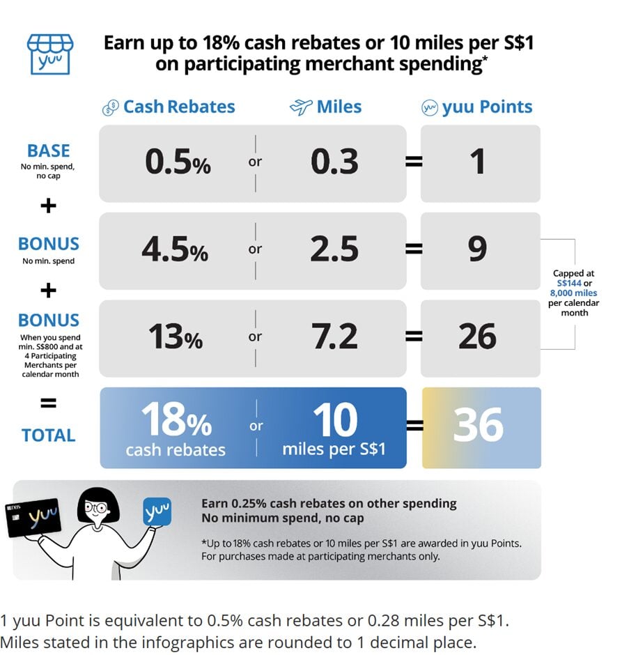 Simply spend regularly at 4 participating merchants each month and meet a min. monthly spend of S$800 on your total card spend to get up to 18% cash rebates or 10 miles per S$1 on participating merchants.