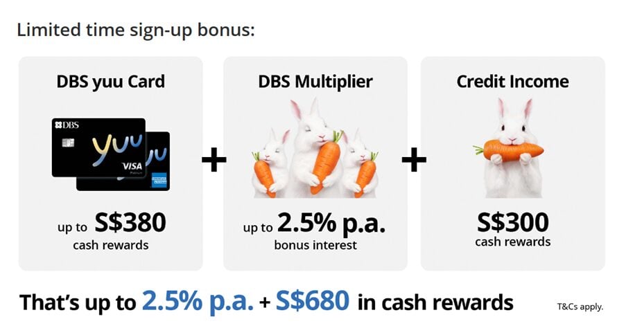 And you can get up to S$380 cash rewards if you sign up for the DBS yuu Card: