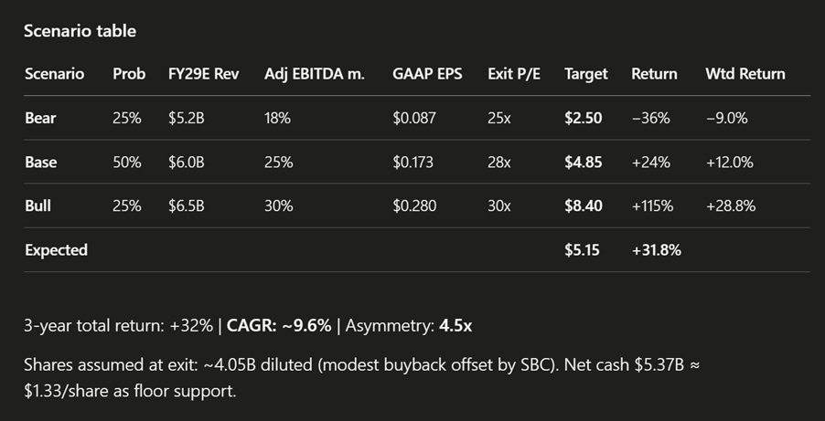 My SOTP builds out to a base case equity value of ~$20B (~$4.90/share), vs. current ~$3.90 — roughly 25% upside.
