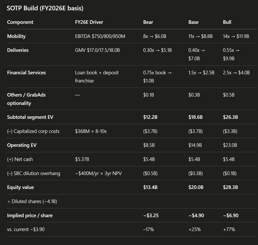 The Bull case is where the Gojek merger closes and significantly reduces Indonesia competition, and GXS Bank + Stash scale into a standalone digital bank worth $4B+, with autonomous vehicle rollout structurally lowers Mobility cost base.