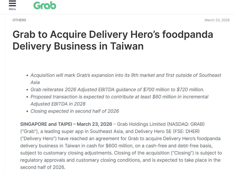 Grab acquires Food Panda Taiwan for $600 million