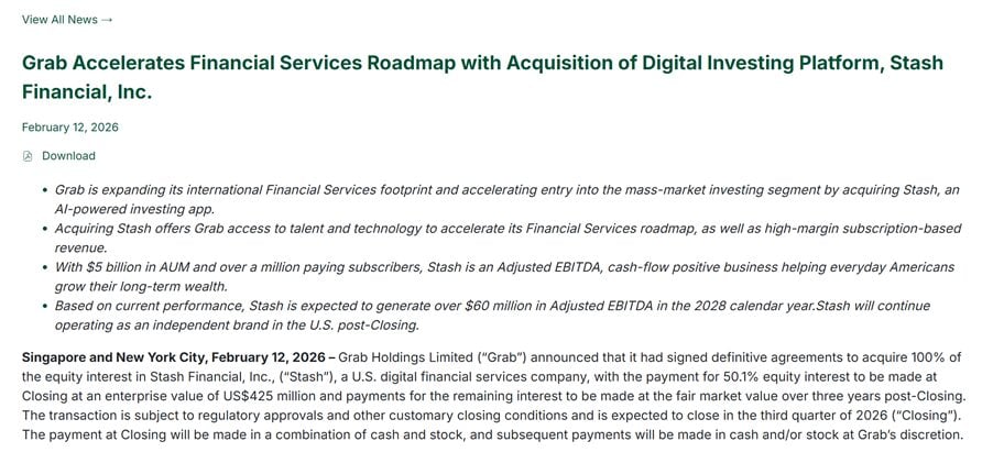 Grab acquires Stash Financial at $425 million Enterprise Value
