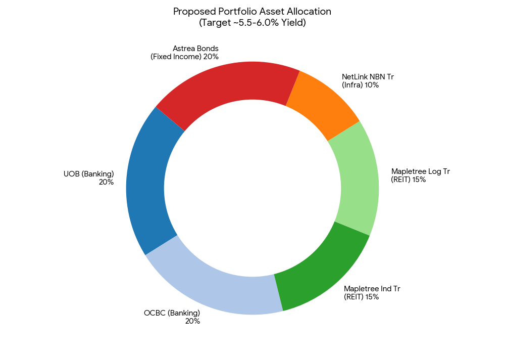 Below is a constructed portfolio that targets ~5.8% – 6.0% yield by anchoring on Singapore banks (currently yielding ~5.6%–6%) and industrial REITs, using Astrea Private Equity Bonds as a lower-volatility substitute for cash.