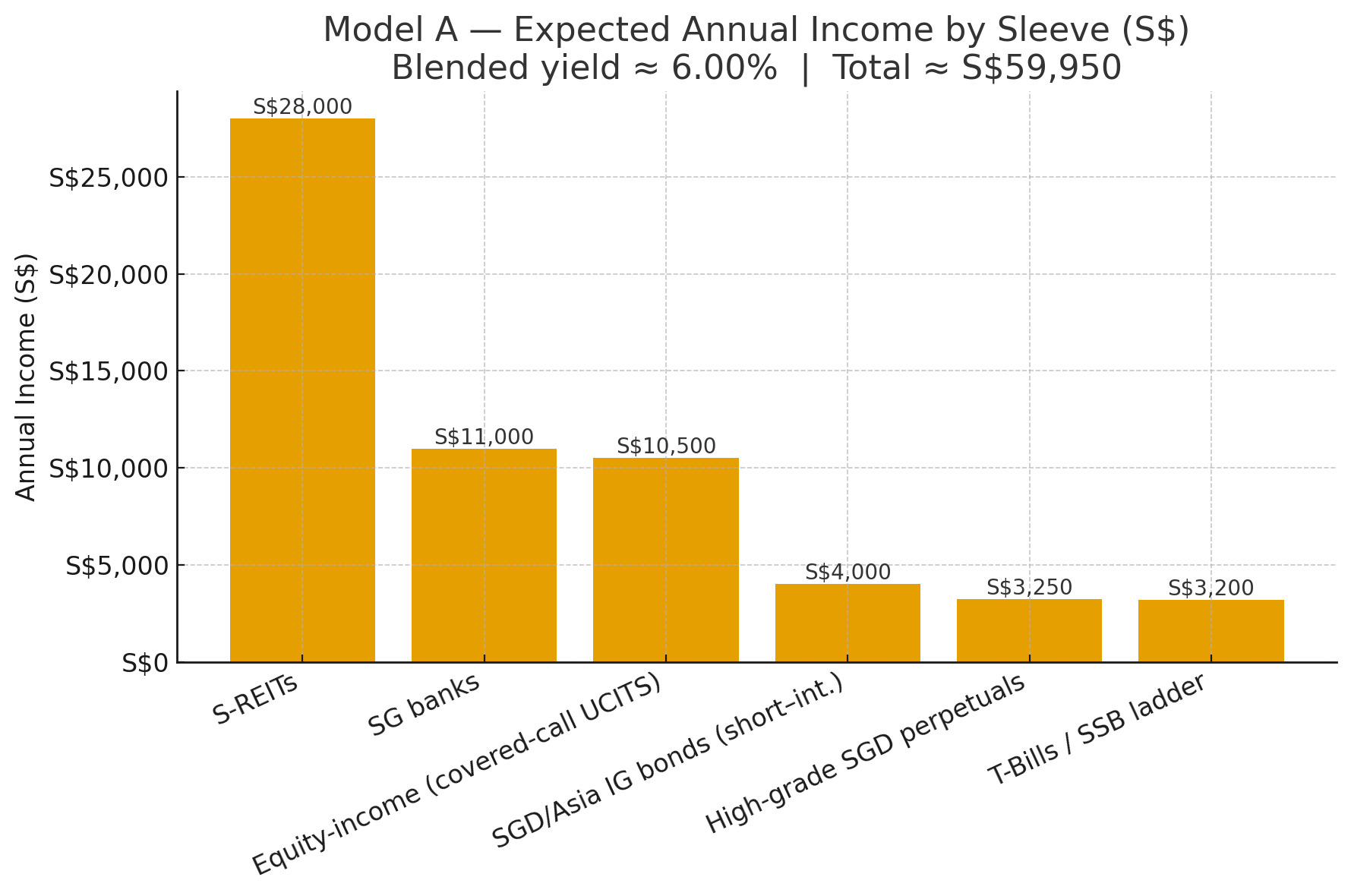 Below is a concrete SGD 1,000,000 allocation that targets ~6.0% portfolio yield using conservative yield assumptions. It’s “medium” risk (not low): equity drawdowns are possible, but income should remain resilient across cycles.