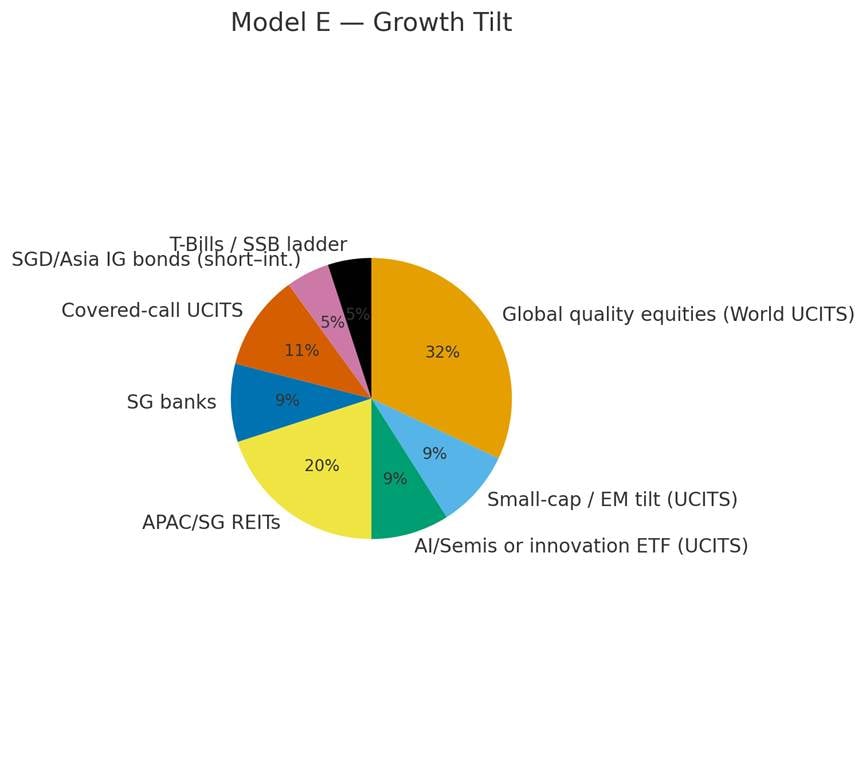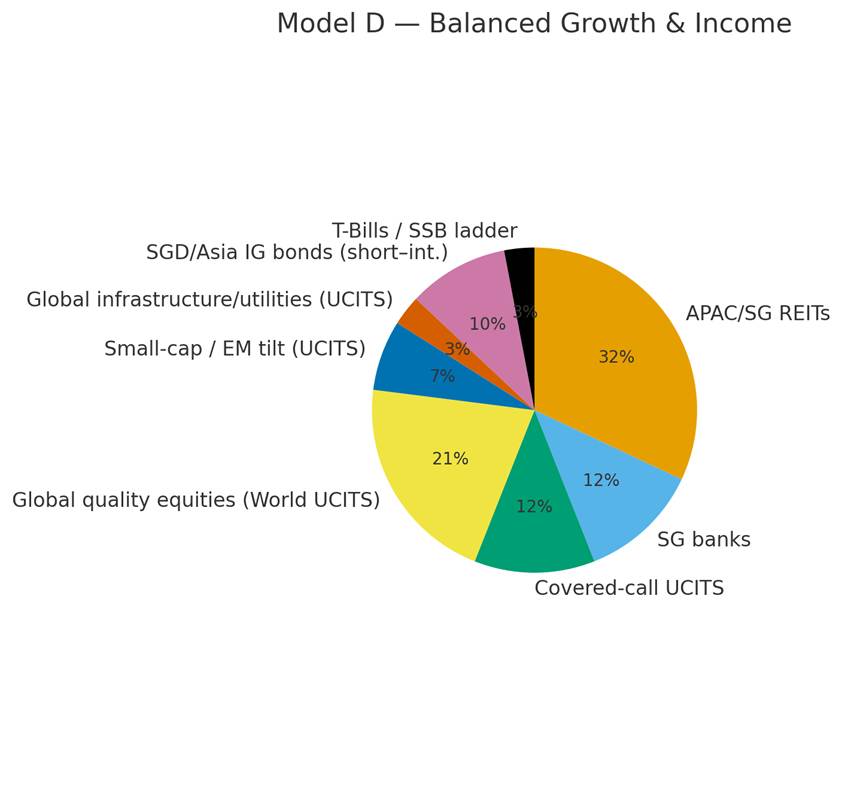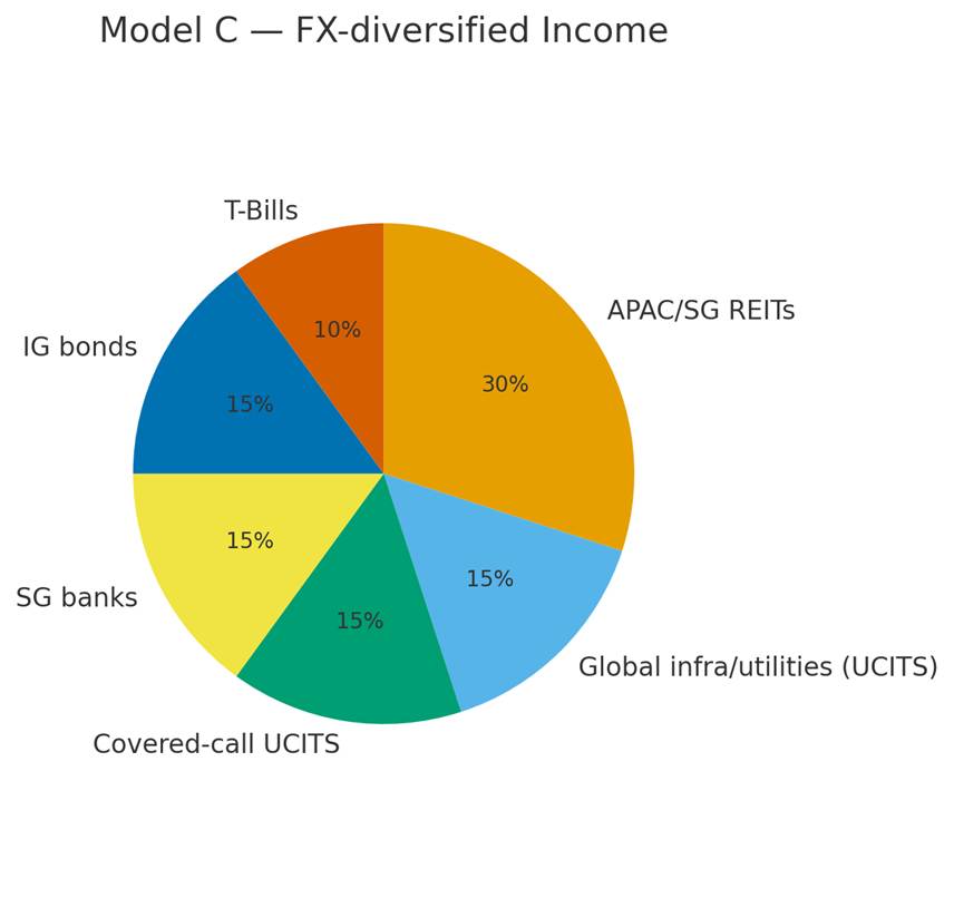 - 30% APAC/SG REITs, 15% global infra/utilities (UCITS), 15% covered-call UCITS, 15% SG banks, 15% IG bonds, 10% T-Bills.