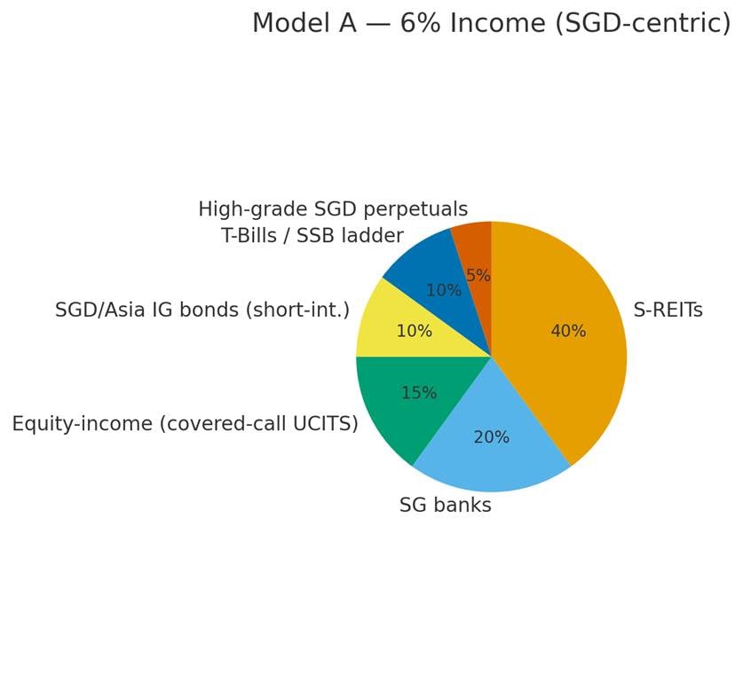 - Reality check: Truly low-risk SGD instruments (T-Bills, SSBs, IG bonds) don’t reach 6% cash yield. Hitting 6% requires equity income (REITs, banks) and a small credit sleeve (perps).