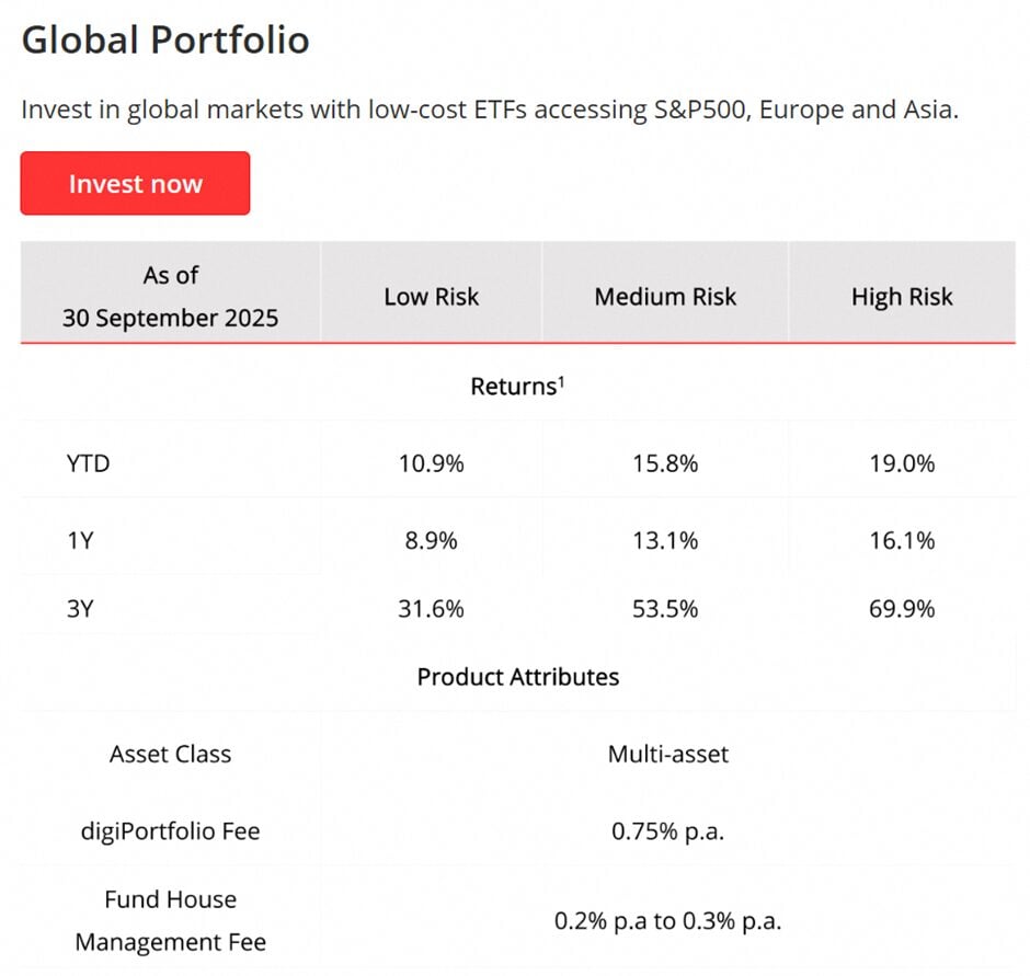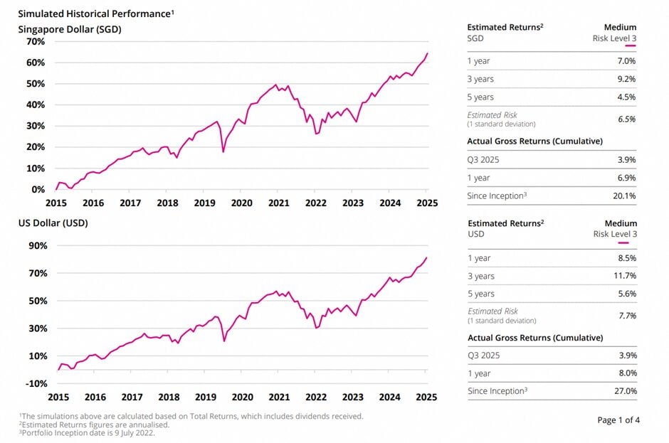 As of 30 September 2025, DBS reports for the Global Portfolio (medium risk) a 1-year cumulative total return of 13.1% in USD and a 3-year cumulative total return of 53.5% in USD, gross of fees.