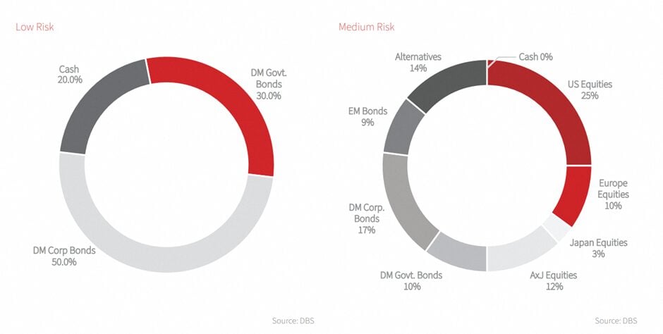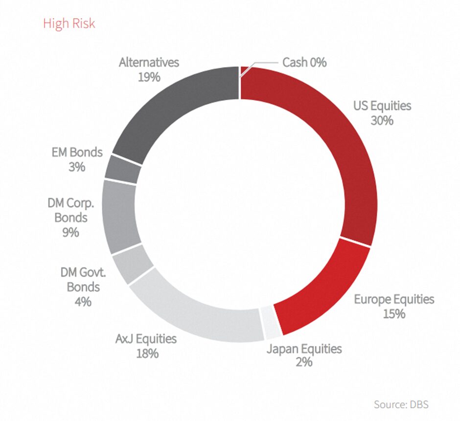 DBS CIO Insights asset allocations for low medium and high risk are set out below – and this gives you an idea of what it means by diversification across asset classes and geographies.