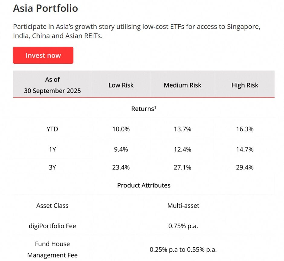 Returns are pretty decent. As of 30 September 2025, DBS reports for the Asia Portfolio (medium risk) a 1-year cumulative total return of 12.4%, in SGD and gross of fees.