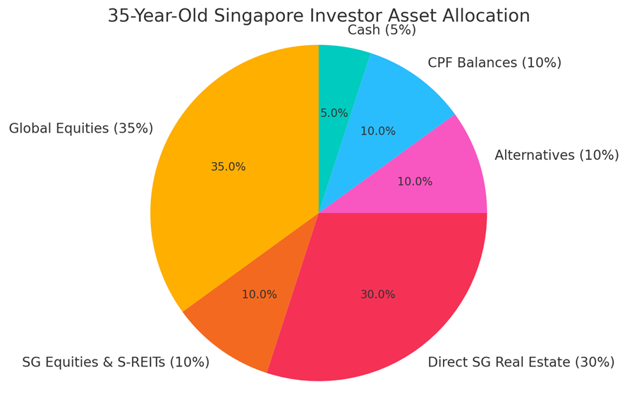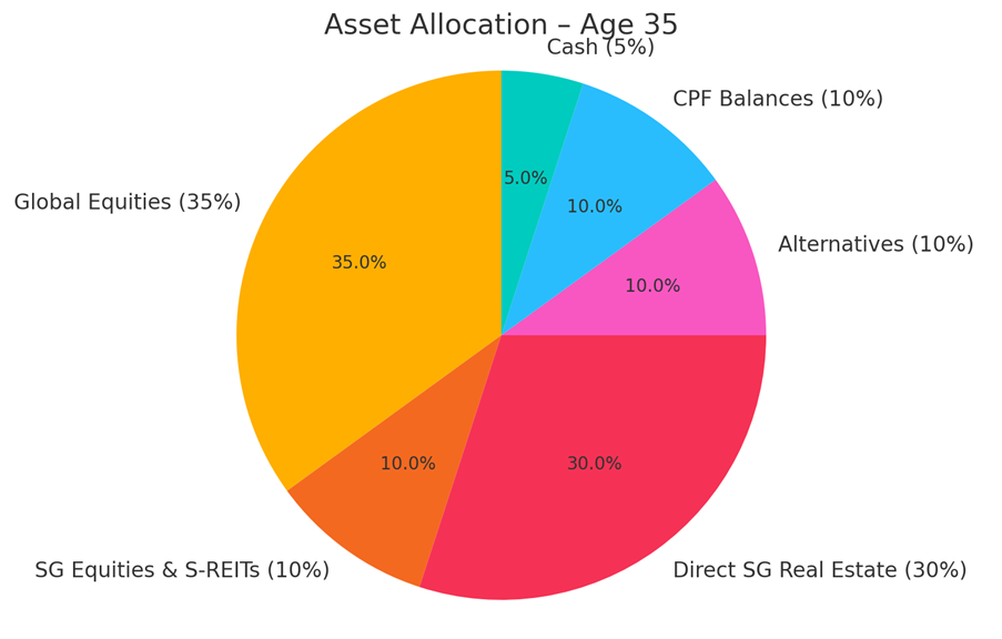 - Age 35 (baseline): shift to our prior mix – equities 45 %, real estate 30 %, CPF 10 %.