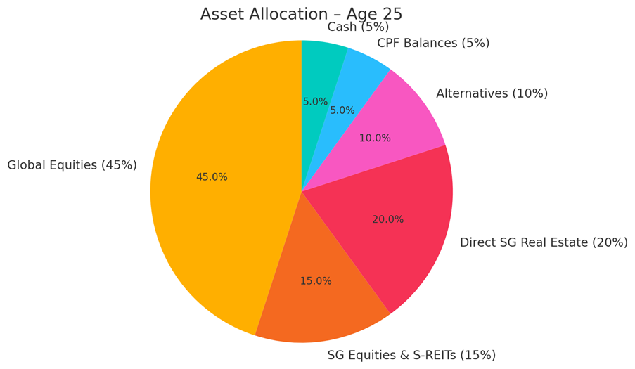 - Age 25: stay aggressive – equities 60 %, real estate 20 %, CPF only 5 %.