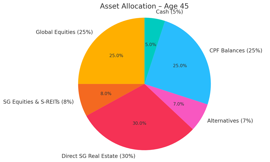 - 45 % equities (35 % global, 10 % SG equities/REITs), 30 % direct SG real estate, 10 % alternatives, 10 % CPF balances, 5 % cash.