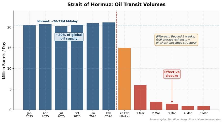 Beyond that, Gulf storage exhausts and the oil shock becomes structural rather than transitory.