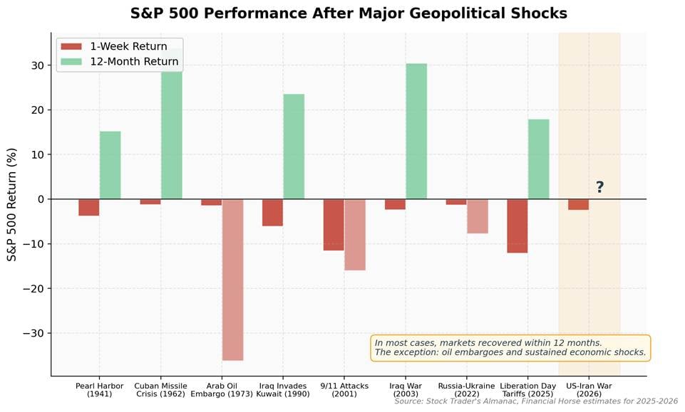 The average one-week drop in the S&P500 after a major geopolitical shock is about 1%. Twelve months later, the average gain is around 3%.