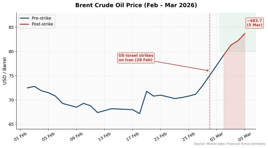 In this world, Brent settles $80–90 during hostilities, drops to $70–75 post-ceasefire. Equity markets recover within 4–8 weeks.