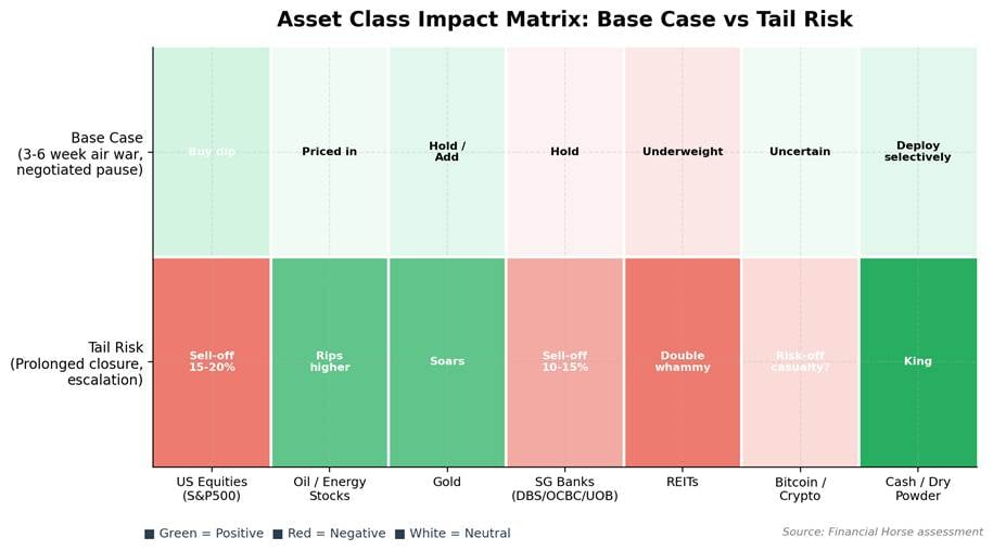 | US Equities (S&P500) | Buy the dip if sell-off deepens. War impact likely transitory. | Could drop 15–20% if Hormuz stays shut 3+ weeks. |