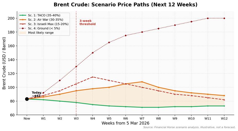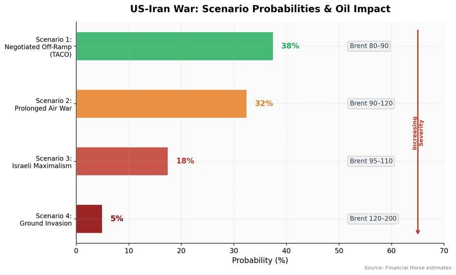 My base case is a messy 3–6 week air campaign followed by a negotiated pause. Brent in the $80–95 range. Equity markets volatile but ultimately recover.