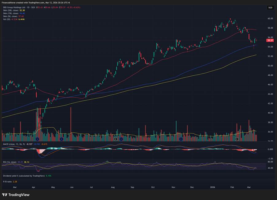 DBS at $55 has dropped roughly 10% from the top, and sits right on the 150 day moving average.