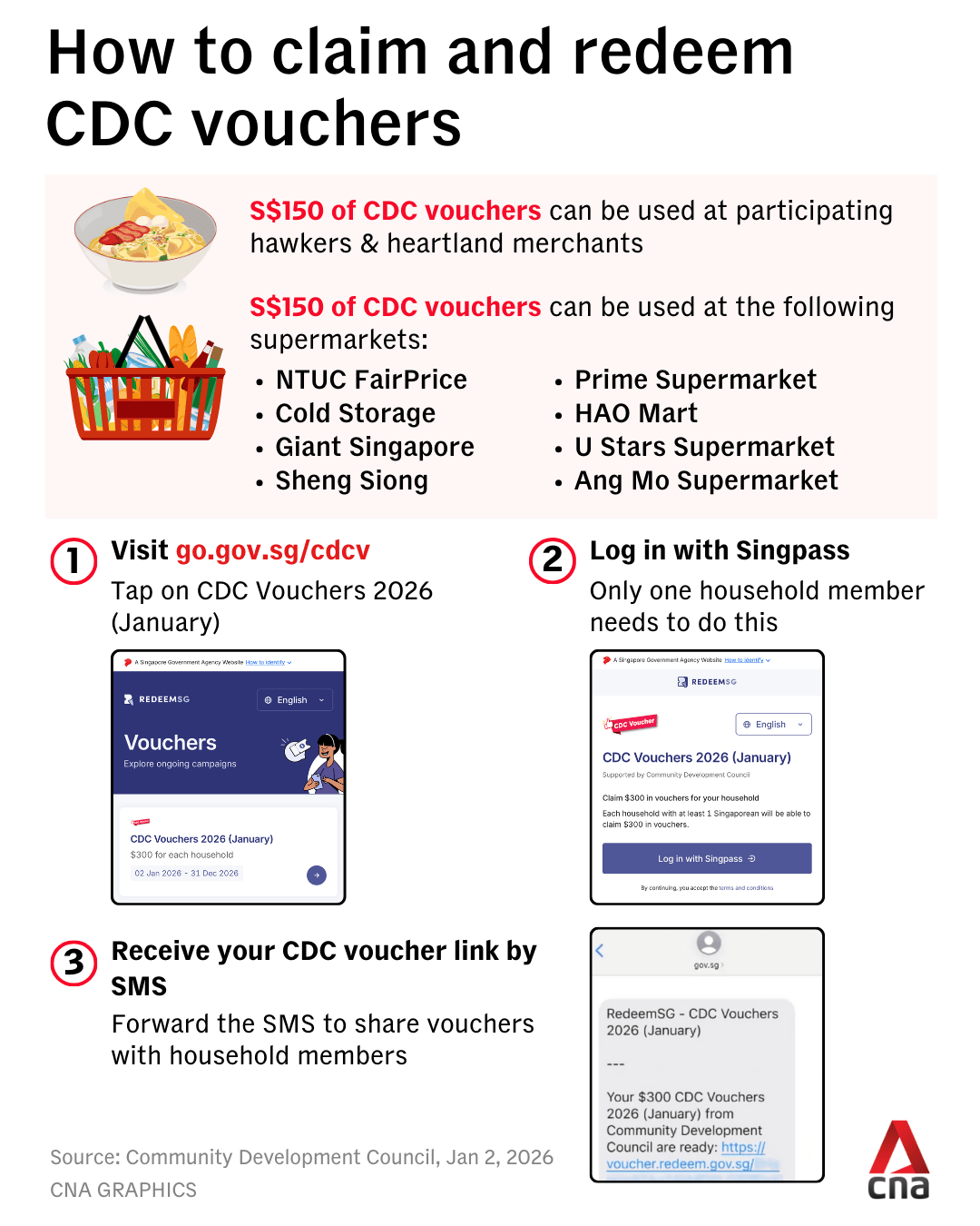 - CDC Vouchers: households can claim $300 in Jan 2026, valid till 31 Dec 2026.