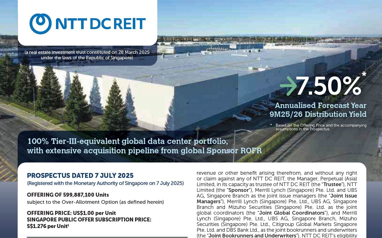 | NTT DC REIT (IPO) | Global DC (US 72 %, EU 17 %, SG 9 %) | 7.0 – 7.8 % (prospectus FY 25/26 range) | n/a (new listing) | ~35 % post-listing |