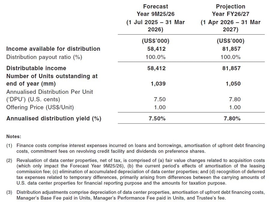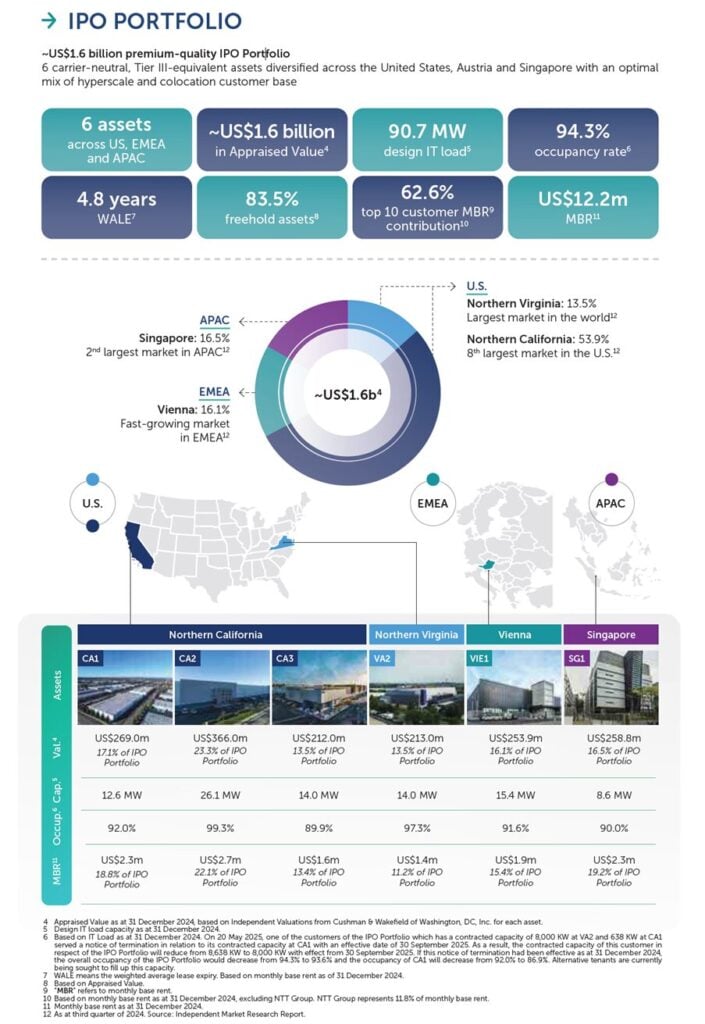 | NTT DC REIT (IPO) | US 72 %, EU 17 %, SG 9 % | 7.0 – 7.8 % (prospectus FY 25/26 range) | n/a (new listing) | ~35 % post-listing |