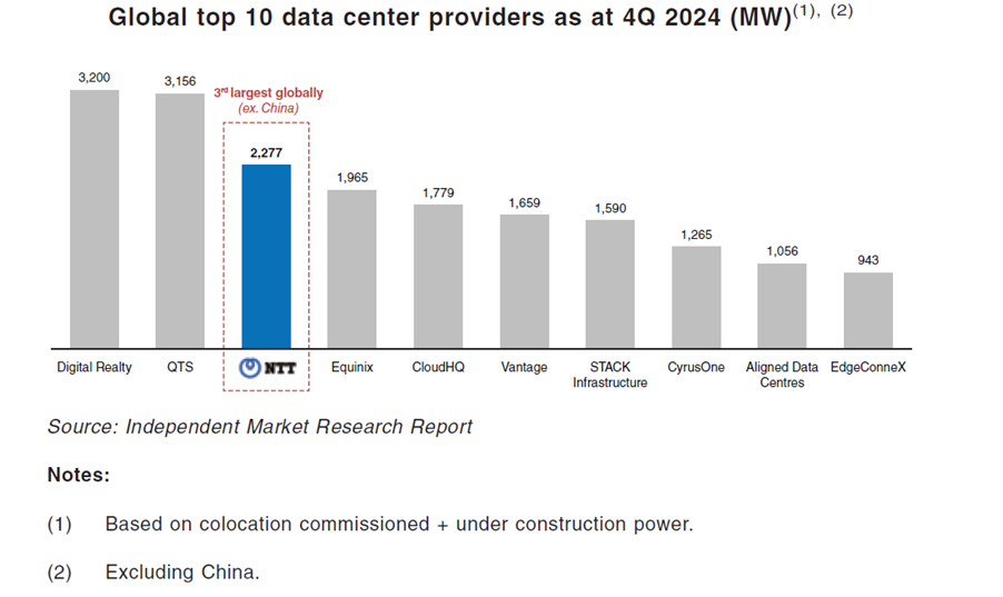 | Secular demand for DC capacity (AI, cloud, edge) | Sustains occupancy & pricing power across cycles | Market overview; NTT GDC’s 2.2 GW portfolio & global footprint |