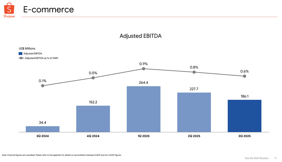 - Shopee commanded 52% of Southeast Asia e-commerce GMV in 2024, up from 48% in 2023, reaching $66.8B. Management targets Shopee EBITDA/GMV margins of 2-3% long-term.