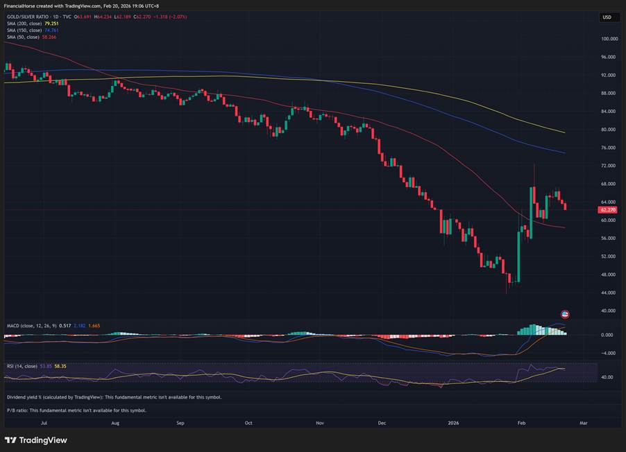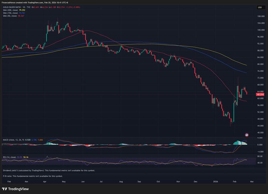 The gold/silver ratio stands at ~63:1, down from above 100 earlier in 2025.