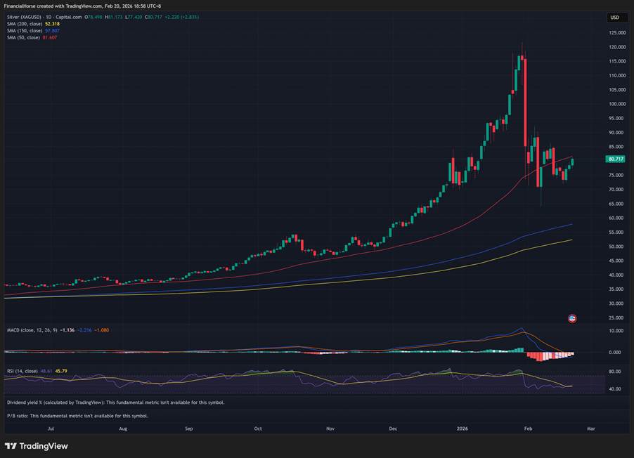 Silver is trading at ~$79/oz today, having pulled back sharply from its all-time high of $121.67 set on January 29, 2026.