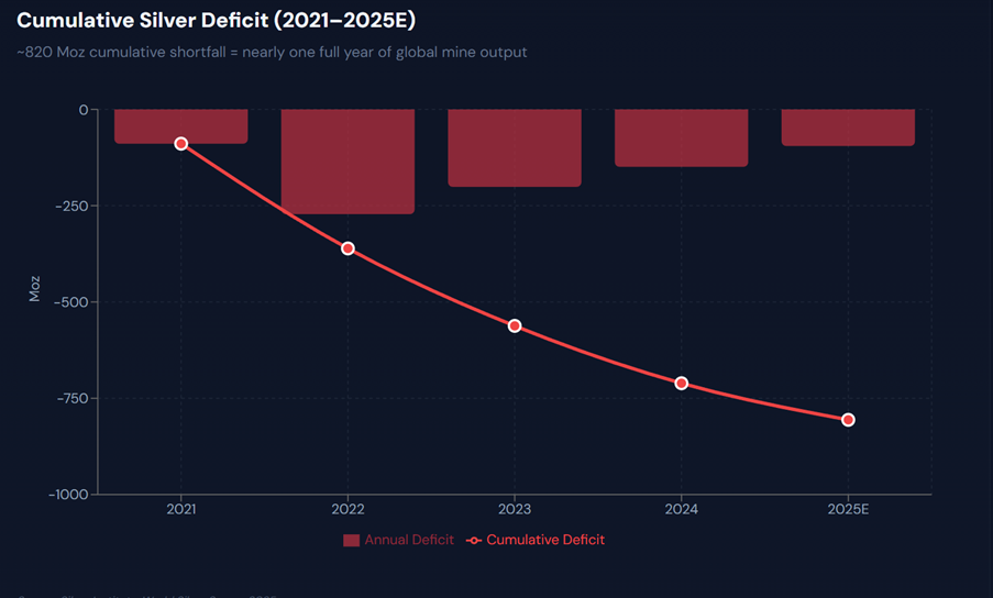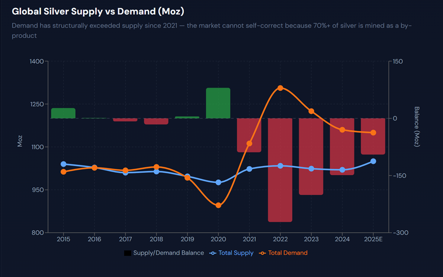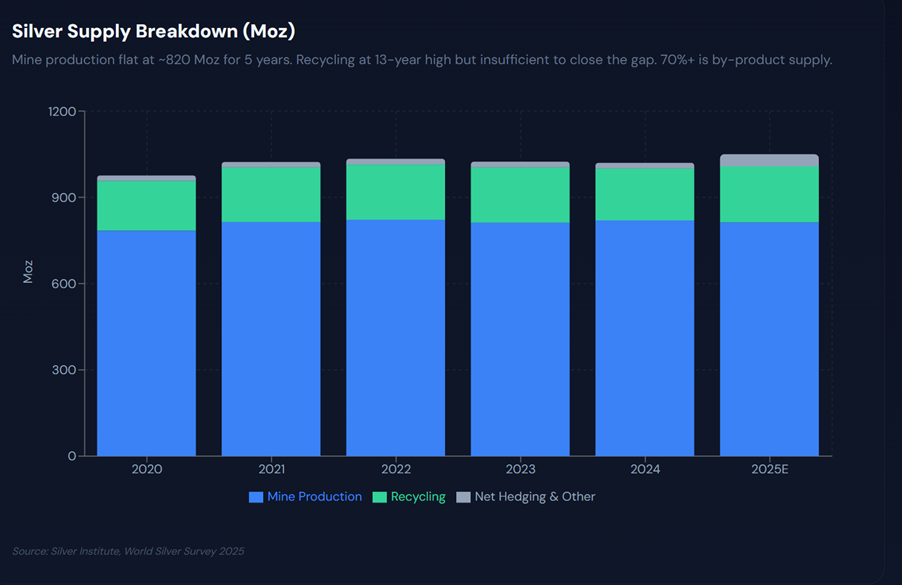 Silver production is structurally constrained, and mine output cannot respond easily to price signals.
