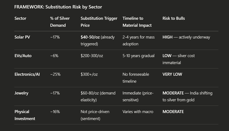 Counterpoint: Copper plating technologies are emerging that could reduce silver intensity. This is real but early-stage — not a near-term demand destroyer.