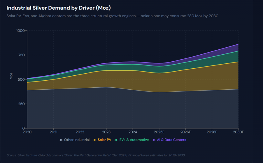 In 2014, the solar sector accounted for ~11% of silver demand; by 2024, it rose to 29%. Solar PV capacity is forecast to reach 665 GW in 2026, supporting ~120-125 Moz of silver demand from solar panels alone.