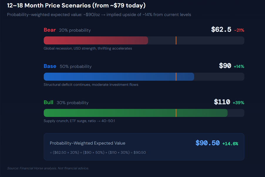 | Bull | 30% | $100-120+ | Supply crunch accelerates, ETF inflows surge, gold/silver ratio compresses to 40-50:1 |
