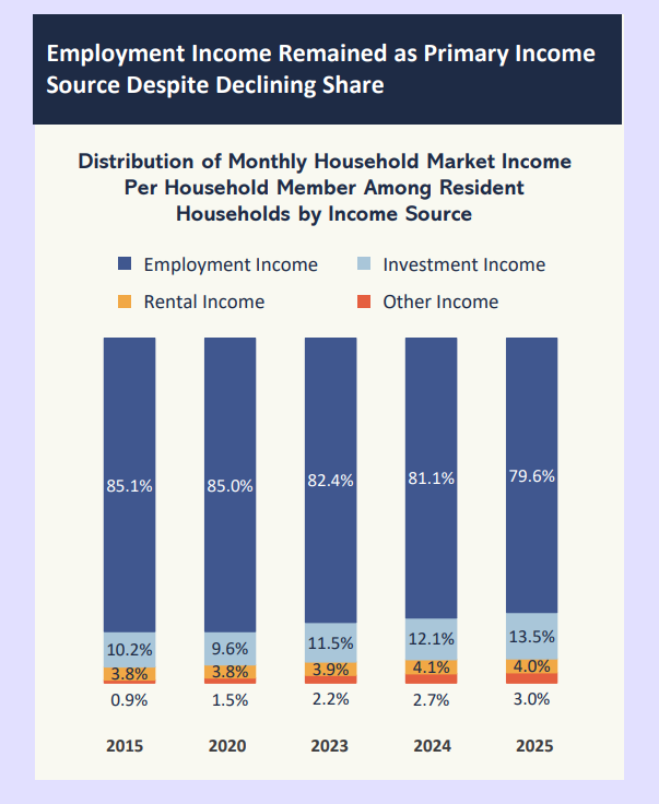 The deeper shift is that “income” is no longer just wages: ageing, CPF payouts, and investment income now shape the picture.