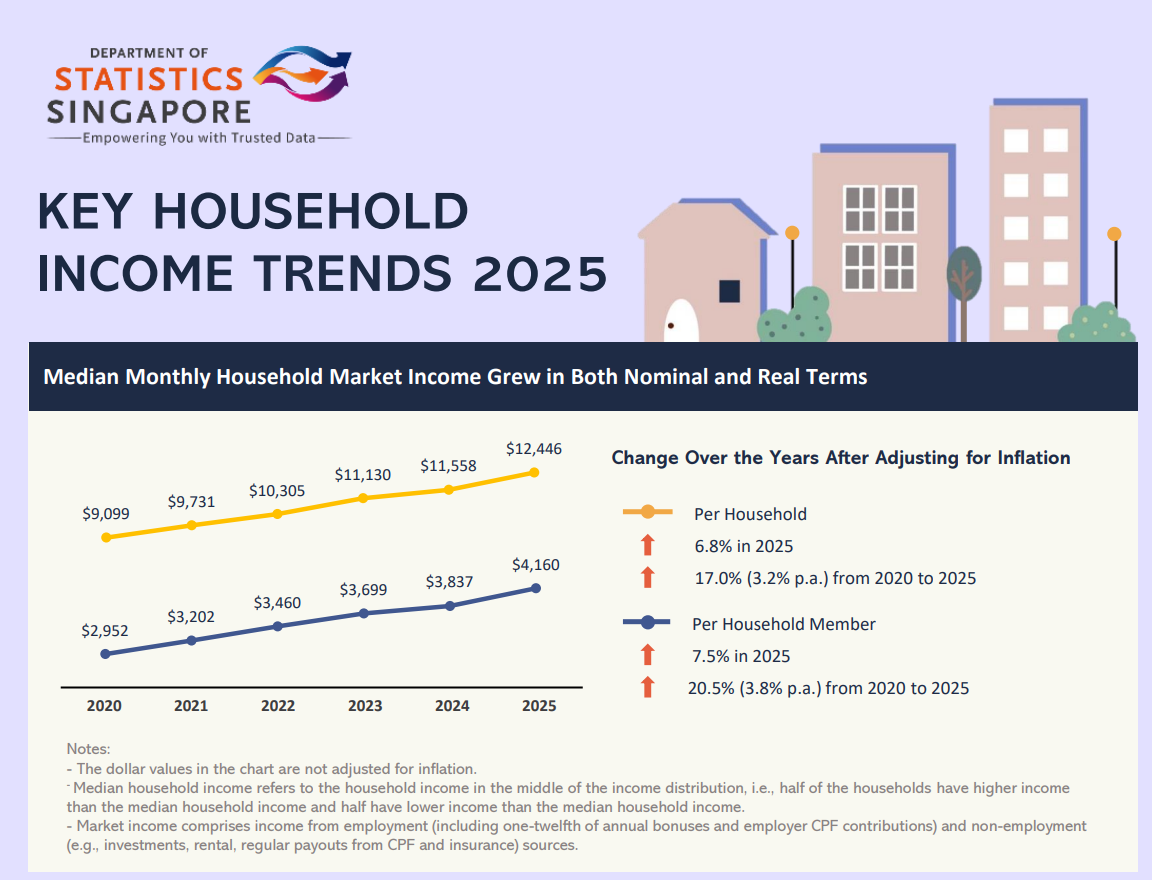Median monthly household market income rose to S$12,446 in 2025, up from S$11,558 in 2024.