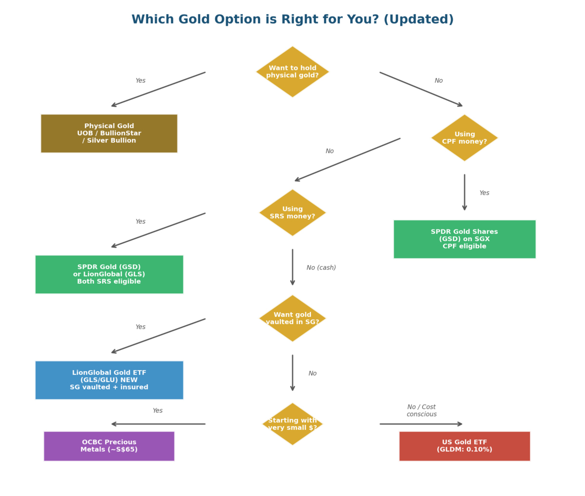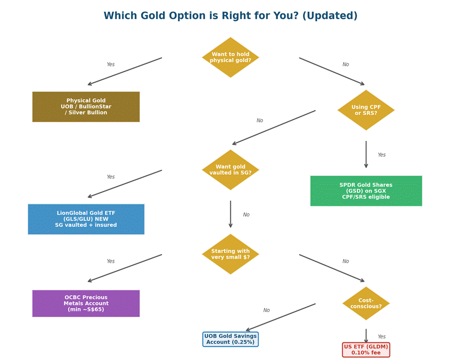 If you haven’t read Part 1 of this guide, here’s a quick recap of all the gold buying options available to Singapore investors — now updated to include the new LionGlobal ETF.
