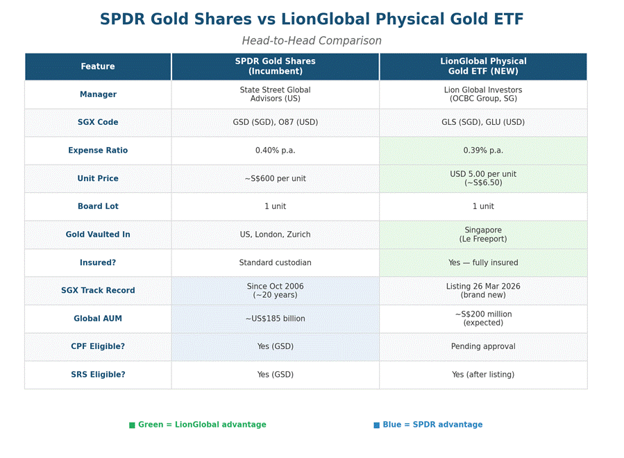 1. Brand new — no track record. SPDR has 20 years on SGX. The underlying LionGlobal gold portfolio has been running since December 2025, but the ETF listing itself is brand new. For conservative investors, SPDR is still the safer choice.