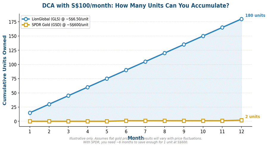 If you’re DCA-ing S$100 per month, with SPDR you need ~6 months to buy your first unit. With LionGlobal, you buy ~15 units every single month.