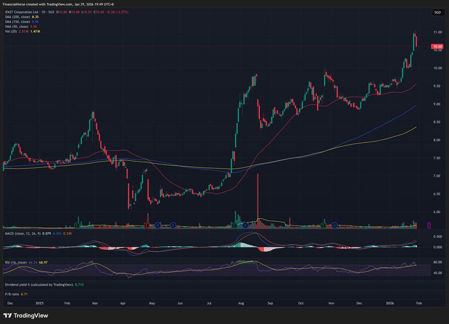 The Thesis: If the SG market is booming, who sells the shovels? iFAST. A bull market means higher AUA (Assets Under Administration) and trading fees. It is the highest beta play to a rising STI.
