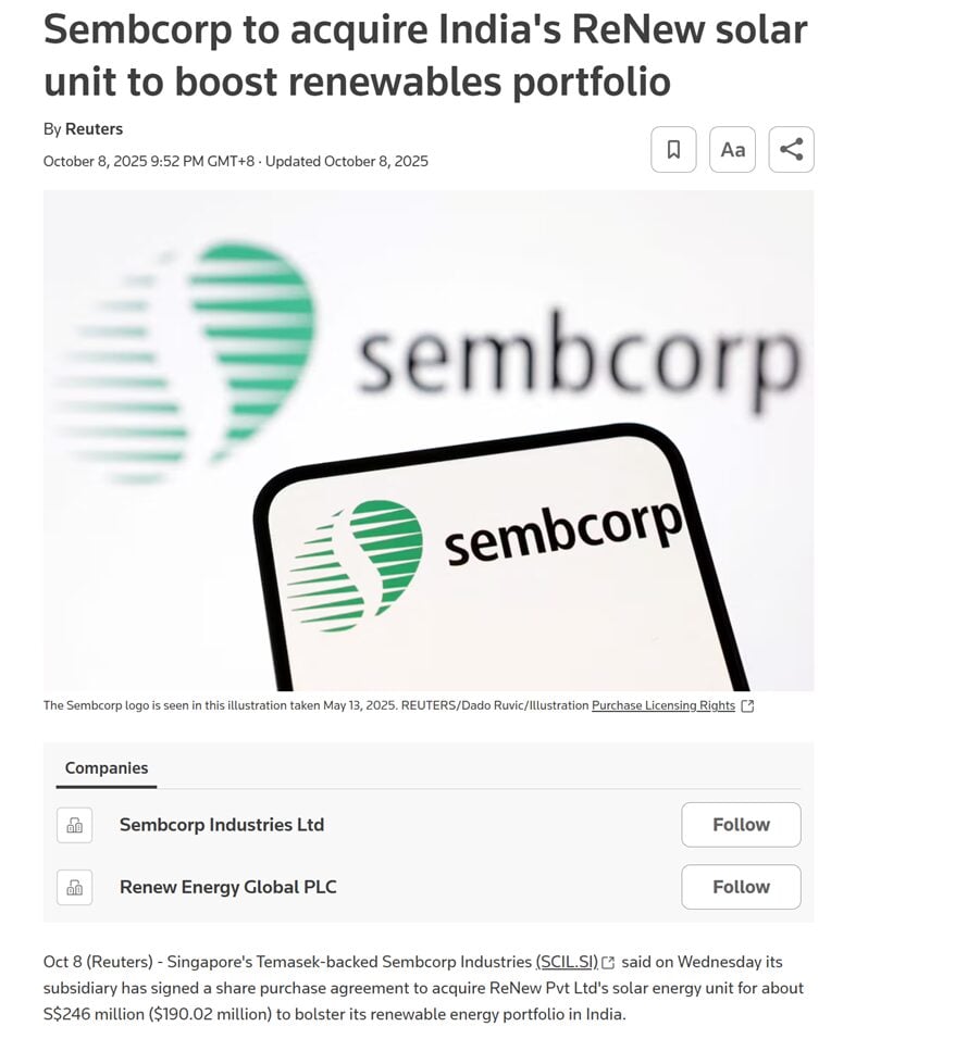 See for example their acquisition of ReNew Pvt Ltd’s solar energy unit for S$246 million to bolster its renewable energy portfolio in India.