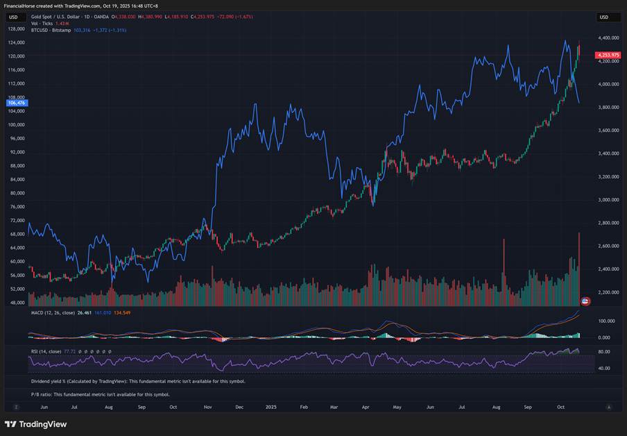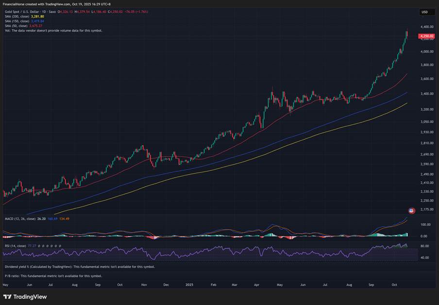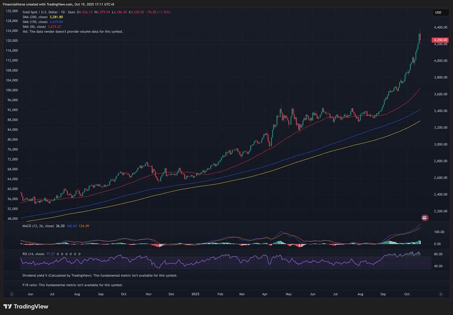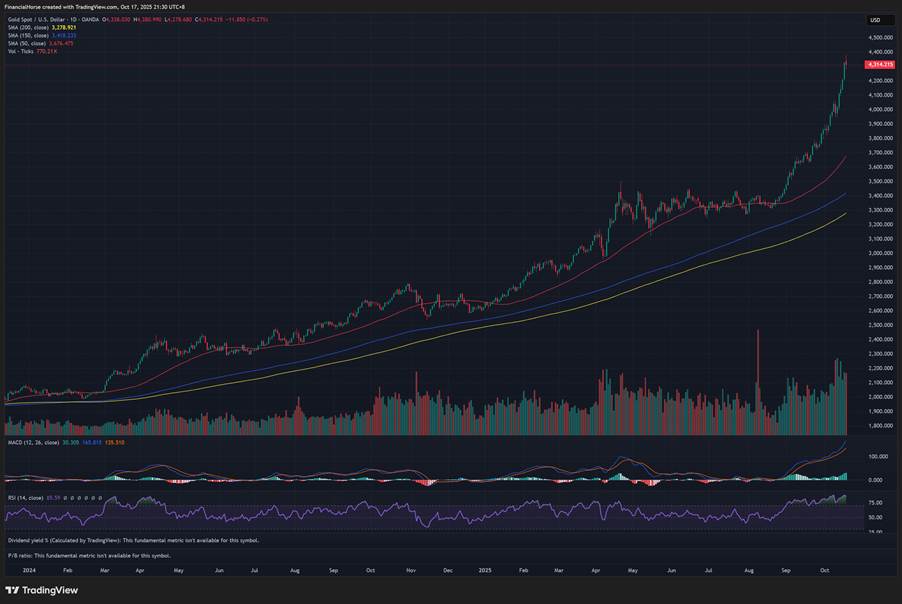 And in Sep 2025 gold began a meteoric rise, that saw gold go as high as 4350 USD/ounce at one point (28% increase in 2 months).