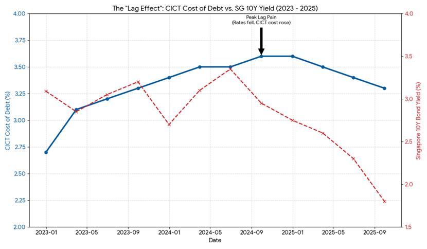 Visualised below – you can see how even though long term interest rates (red) fell sharply from mid 2024, CICT’s weighted cost of debt continued to rise.