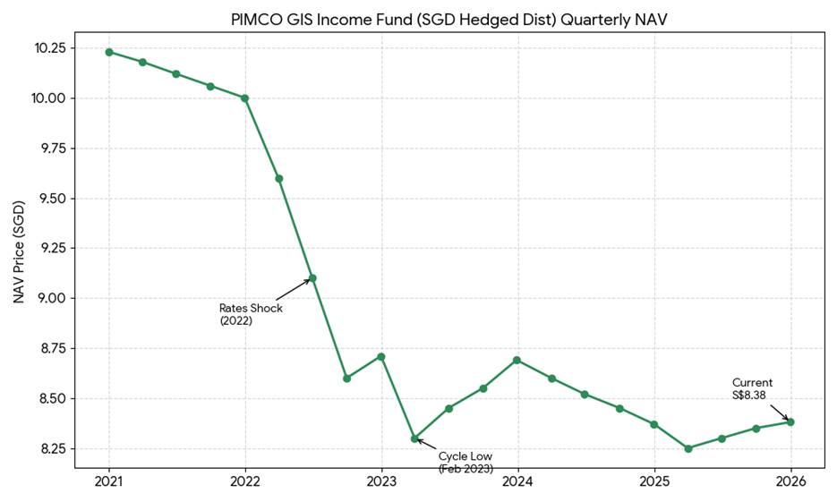 PIMCO GIS Income Fund price plotted below, you can see how the share price fell almost 20% in 2021 to 2023 with rising interest rates.
